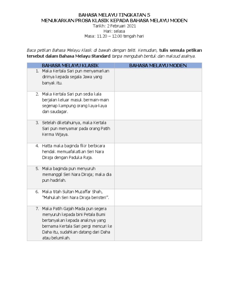 Menganalisis dan menulis serta memindahkan petikan prosa klasik menjadi petikan prosa moden 1. Pdpr tingkatan 5 kssm tahun 2021 bahasa melayu prosa klasik tarikh. Perkataan klasik yang ada dalam petikan tersebut perlu ditukar kepada bahasa moden.